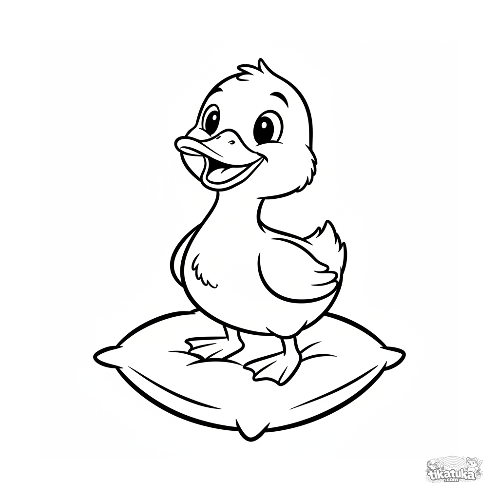 Página para colorear para los más pequeños: un lindo patito sentado en un cojín. Formas muy simples y grandes, para niños desde 2 años.
