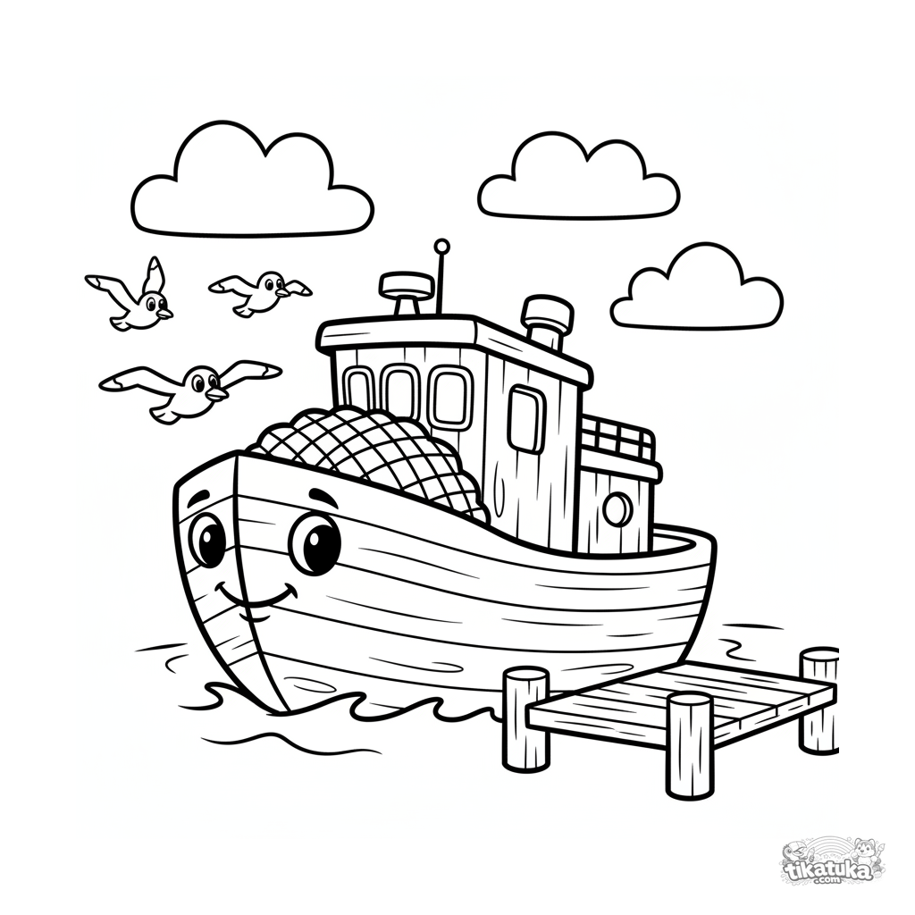 Página para colorear para niños pequeños: un arrastrero de pesca simple sale del muelle. Formas grandes y claras que se asemejan a un juguete de madera.
