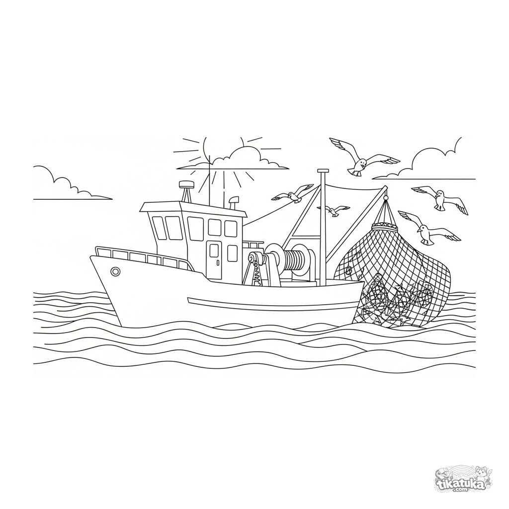 Página para colorear para niños de 4-6 años: un arrastrero de pesca recoge una red llena de peces en mar abierto. Gaviotas vuelan alrededor.