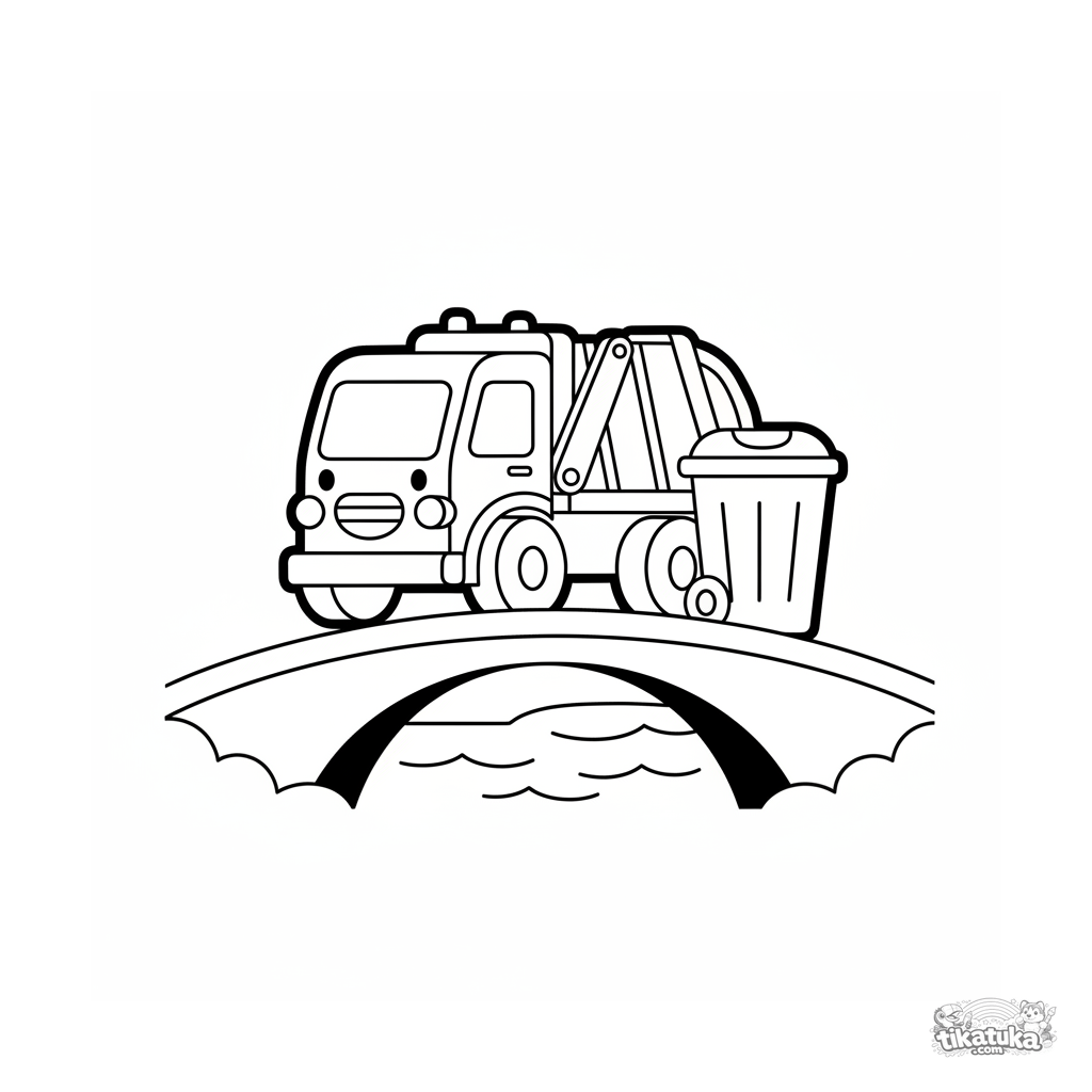 Página para colorear súper simple para niños pequeños 2-3: un camión de basura feliz con el brazo levantado está detenido en un puente sobre un río. Contornos muy gruesos.