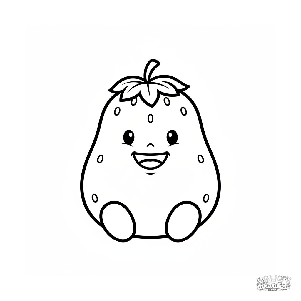 Página para colorear muy simple con una fresa grande y sonriente para niños de 2-3 años. Formas grandes, contornos gruesos, mucho espacio.