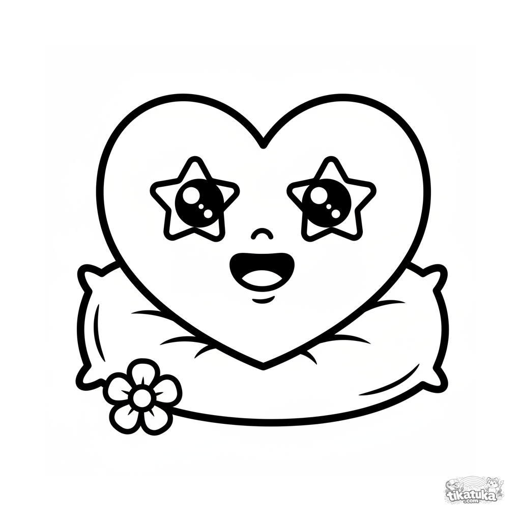 Página para colorear muy simple para 2+ años: un corazón grande con cara sonriente descansa en un cojín. Perfecto para primeras experiencias.