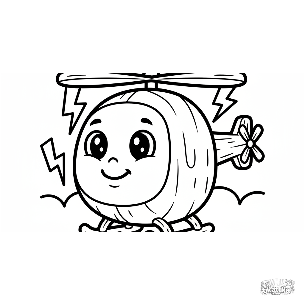 Página muy simple para colorear de un helicóptero para niños pequeños de 2-3 años. Un helicóptero con forma de juguete flota en un cielo con rayos.