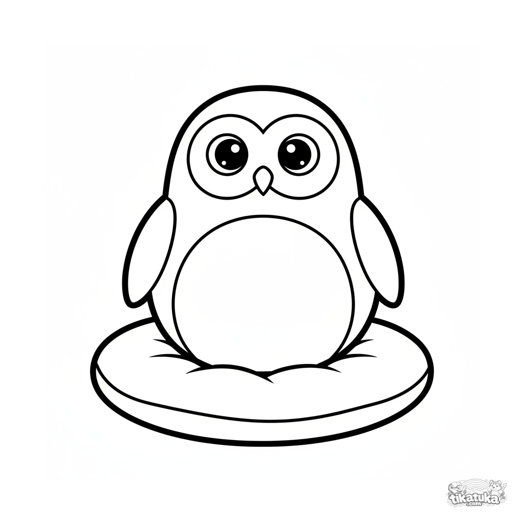 Página para colorear para 2-3 años: un búho de peluche redondo con ojos grandes se sienta en un cojín suave. Formas muy simples.