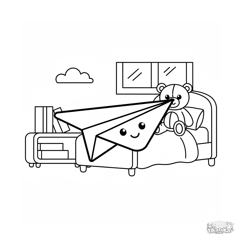Página muy simple para colorear de un avión de papel volando en un dormitorio. Para niños pequeños de 2-3 años. Formas grandes y claras, un oso de peluche y márgenes amplios.