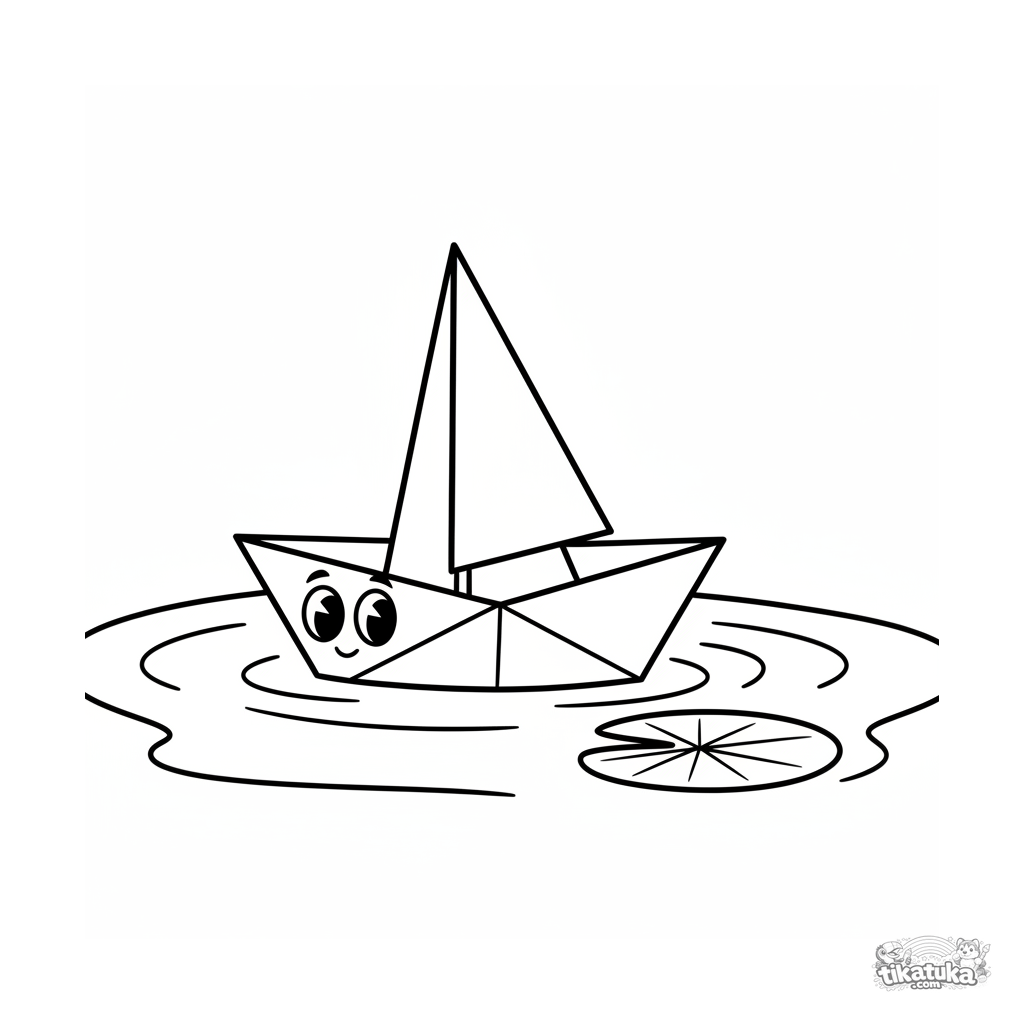 Página para colorear muy simple para niños pequeños de 2 años en adelante: un barco de papel de origami flota en un estanque tranquilo.