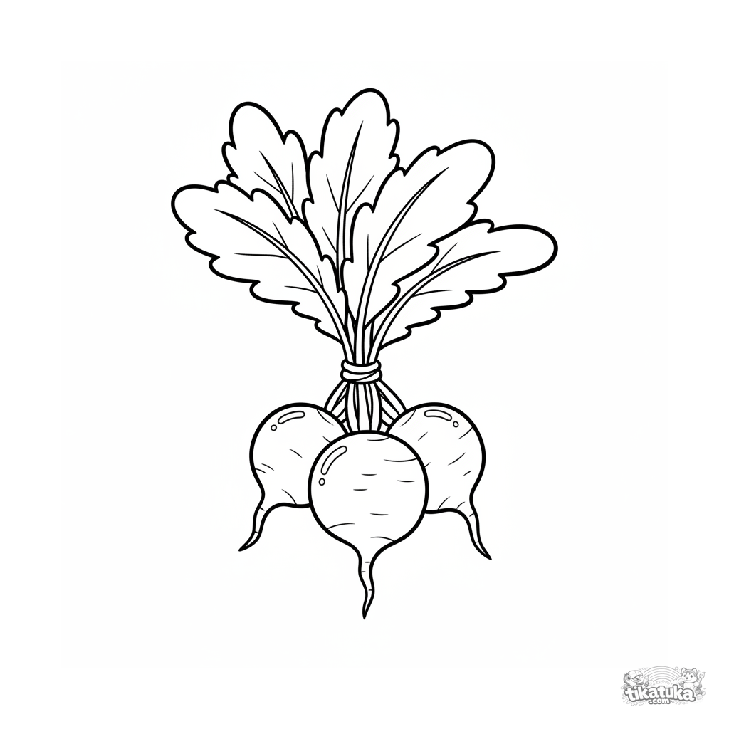 Página muy simple para colorear un manojo de rábanos para los más pequeños. Formas grandes y claras. Para 2-3 años.