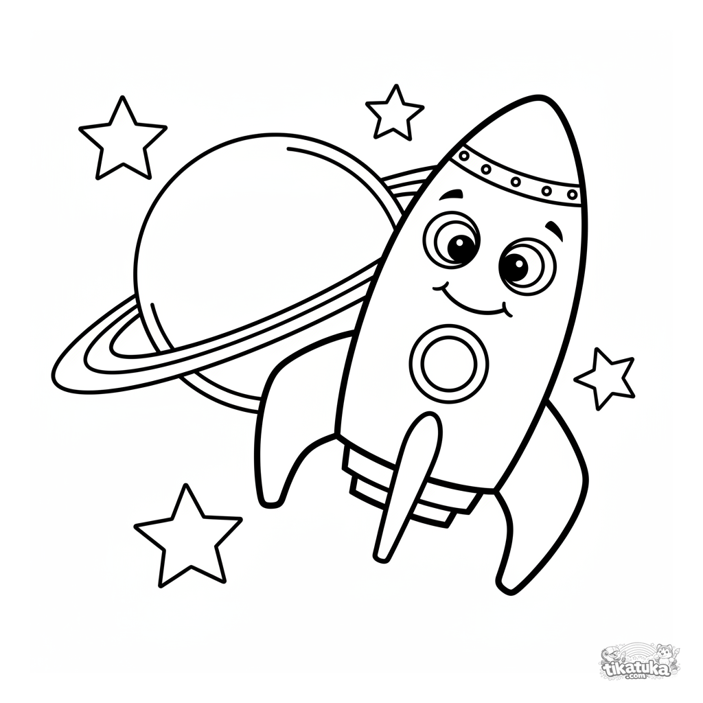 Página para colorear muy simple para niños pequeños de 2-3 años: un cohete sonriente vuela junto a un planeta anillado sobre fondo estrellado.