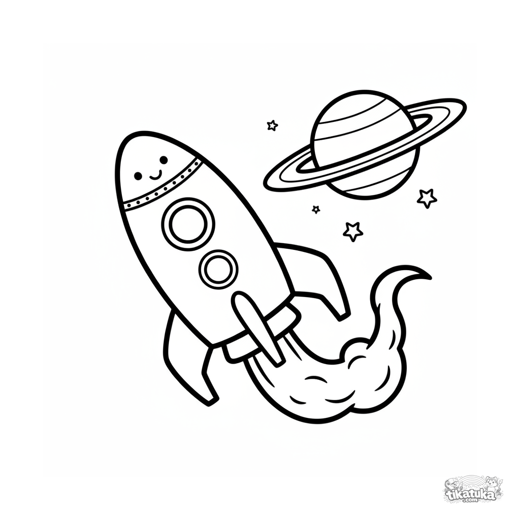 Página para colorear muy simple para bebés 2-3: un cohete sonriente vuela entre estrellas cerca de un planeta con anillos. Formas grandes y fáciles de colorear.