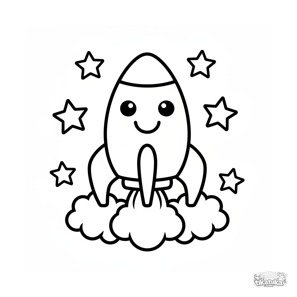 Página para colorear muy simple para bebés de 2-3 años: un cohete sonriente flota entre estrellas grandes. Formas grandes, contornos gruesos.