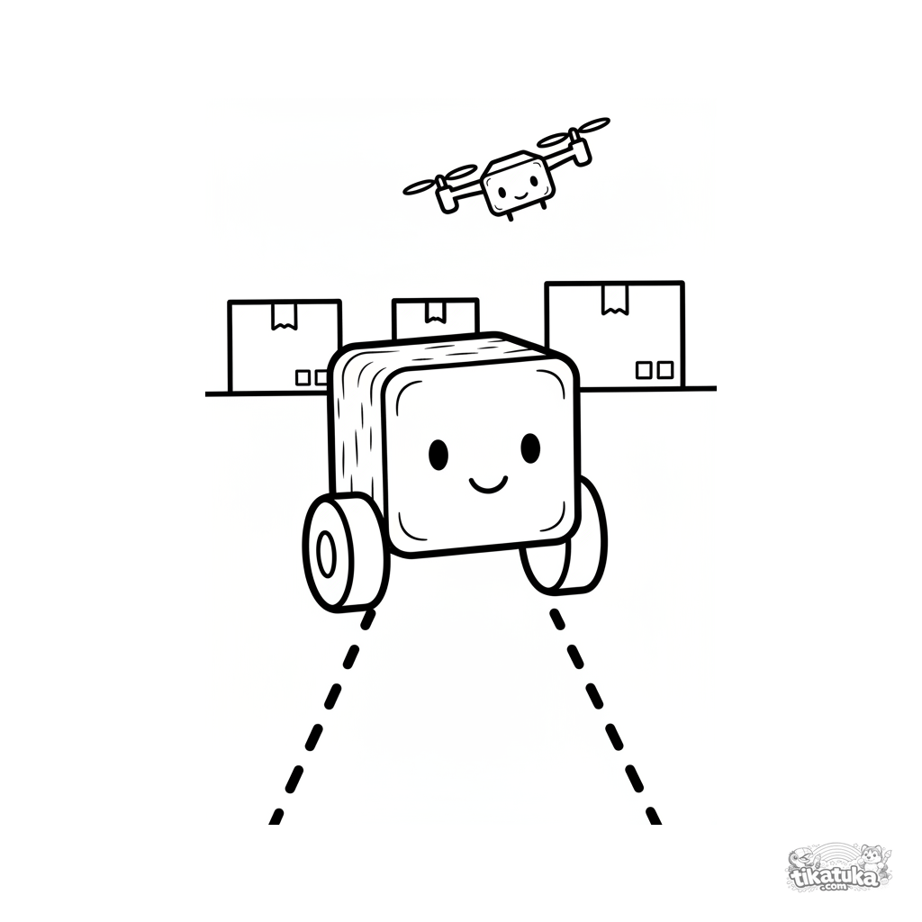 Página para colorear para bebés 2-3: un robot cubo simple rodando en un almacén. Áreas enormes para colorear, formas muy simples, cara sonriente.