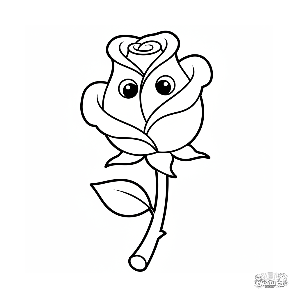 Página muy simple para colorear para niños pequeños 2-3: un capullo de rosa grande con hoja. Márgenes enormes, contornos gruesos.