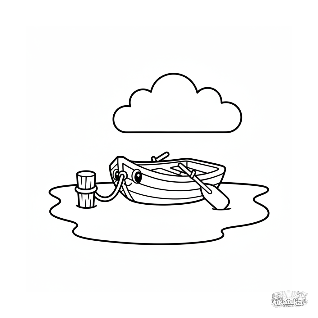Página para colorear muy simple para niños pequeños de 2-3 años: un bote de remos de madera atado a un muelle. Formas grandes y claras.