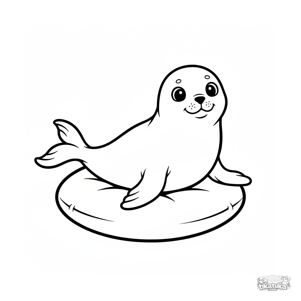 Página para colorear para niños pequeños: una foca simple con ojos grandes descansa sobre su vientre en un cojín suave. Contornos suaves.