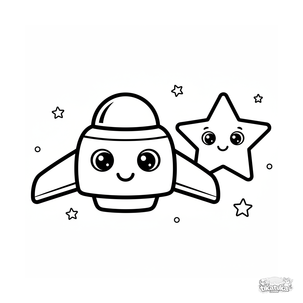 Página para colorear para bebés 2-3 años: una nave espacial simple y amigable con una sonrisa y una gran estrella en el espacio exterior. Grandes márgenes blancos, contornos claros.
