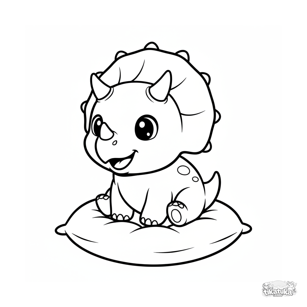 Página para colorear para niños pequeños: un triceratops amigable con ojos grandes sentado en un cojín suave. Formas grandes y claras.