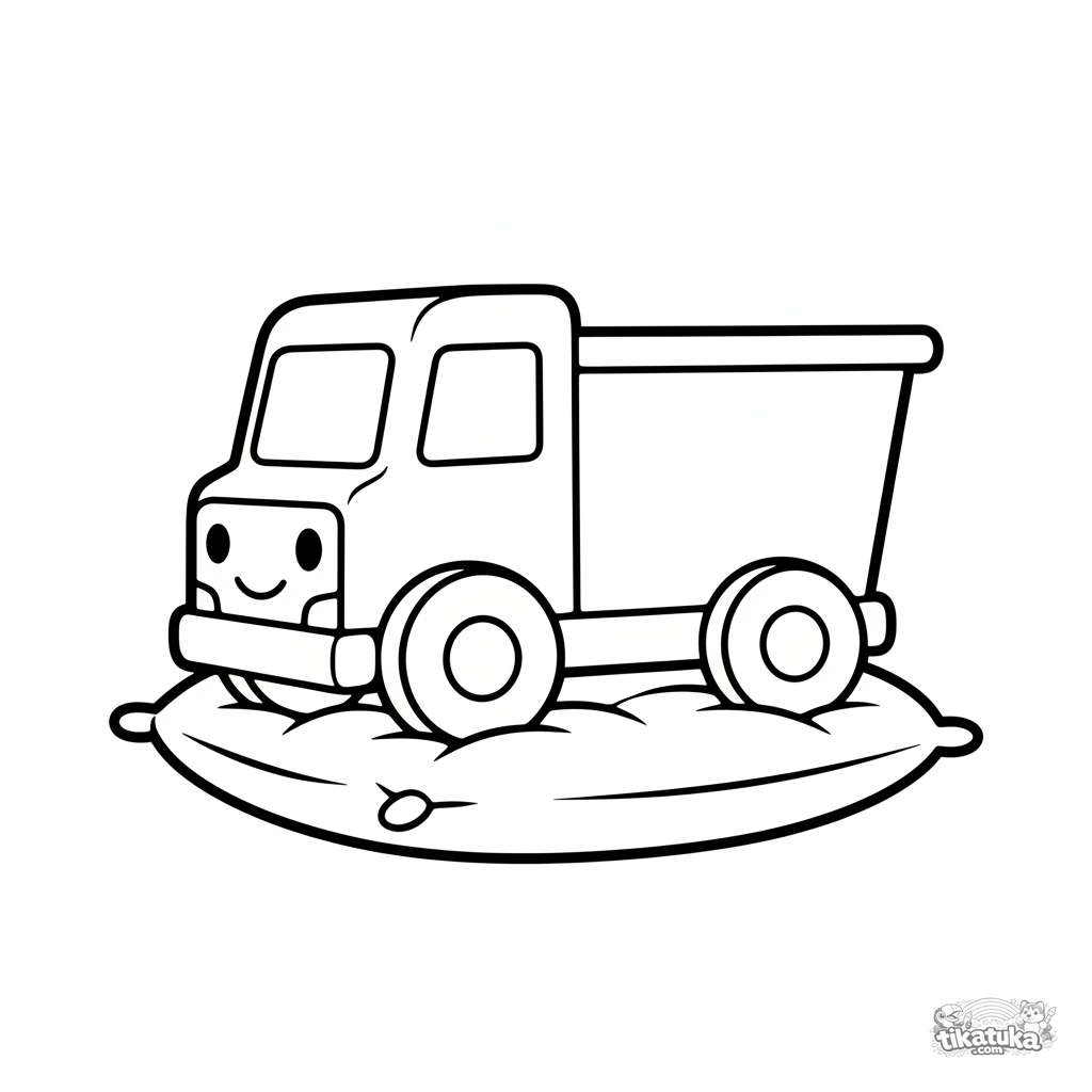 Página para colorear para niños y niñas de 2-3 años: un camión de juguete simple con sonrisa en un cojín. Formas geométricas grandes.
