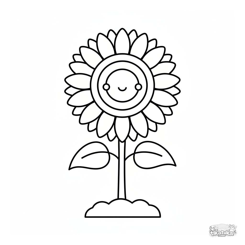 Página para colorear para niños pequeños 2-3: un girasol grande y simple con contornos gruesos creciendo de la tierra. Áreas grandes para colorear.