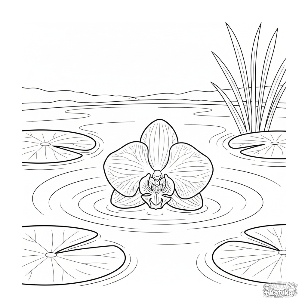 Página para colorear para 7-9 años: una orquídea delicada con pétalos estampados flota en la superficie de un estanque entre nenúfares y ondas.