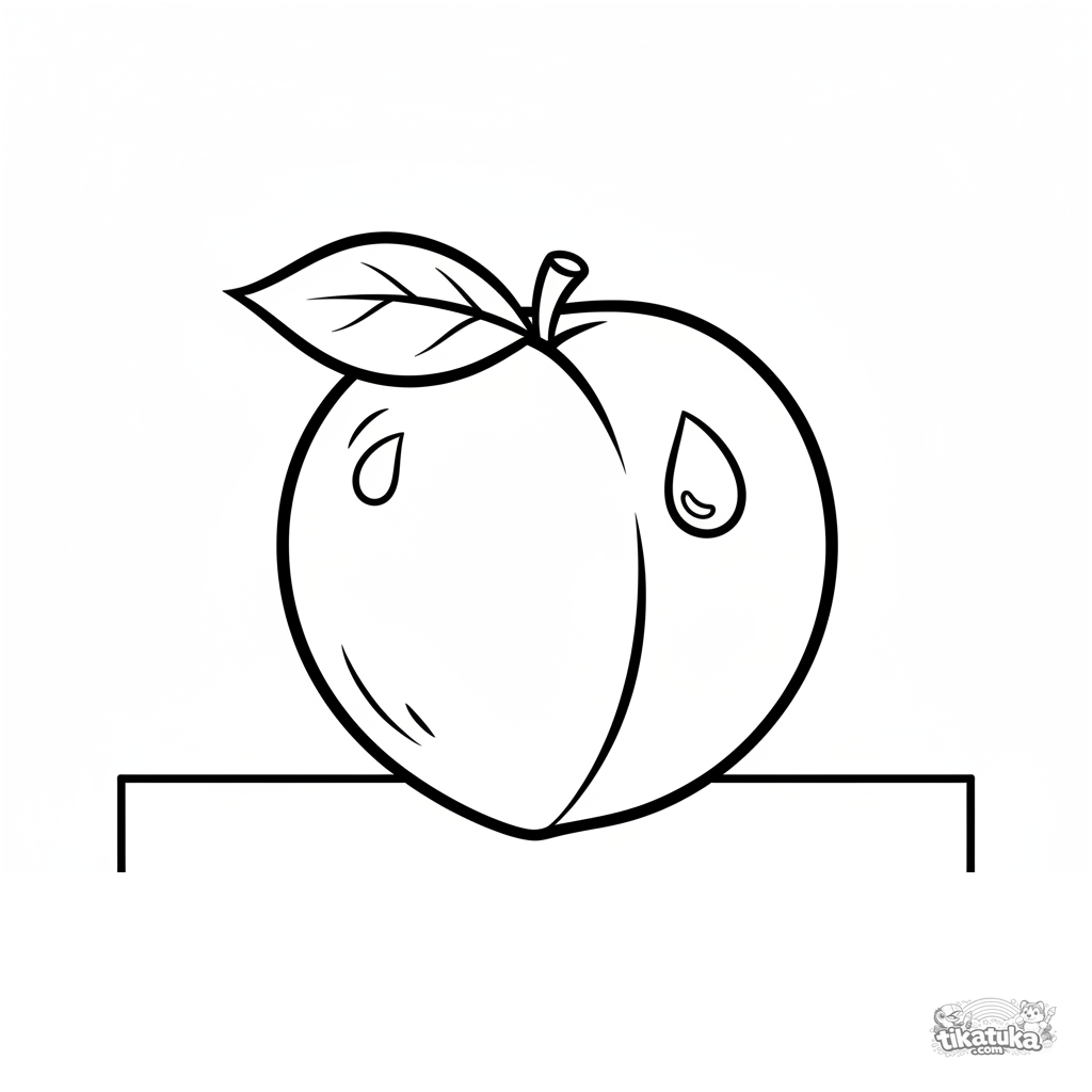 Página para colorear muy simple para niños pequeños 2-3: un solo durazno con una hoja y una gota de rocío. Contornos suaves en estilo boceto acuarela, áreas amplias para colorear.