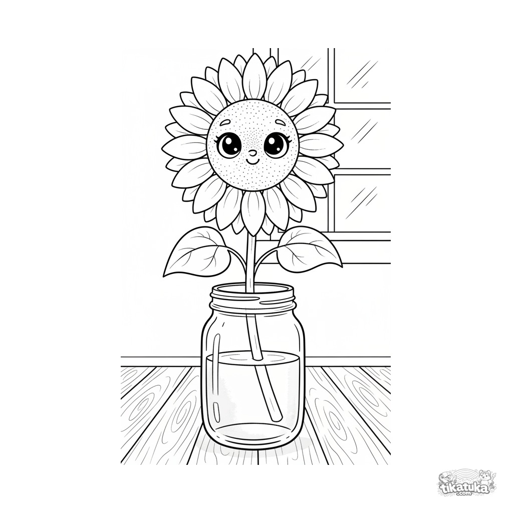 Página para colorear para 7-9 años: un girasol solitario en un tarro de cristal está en las tablas de madera de un porche soleado. Escena veraniega acogedora.