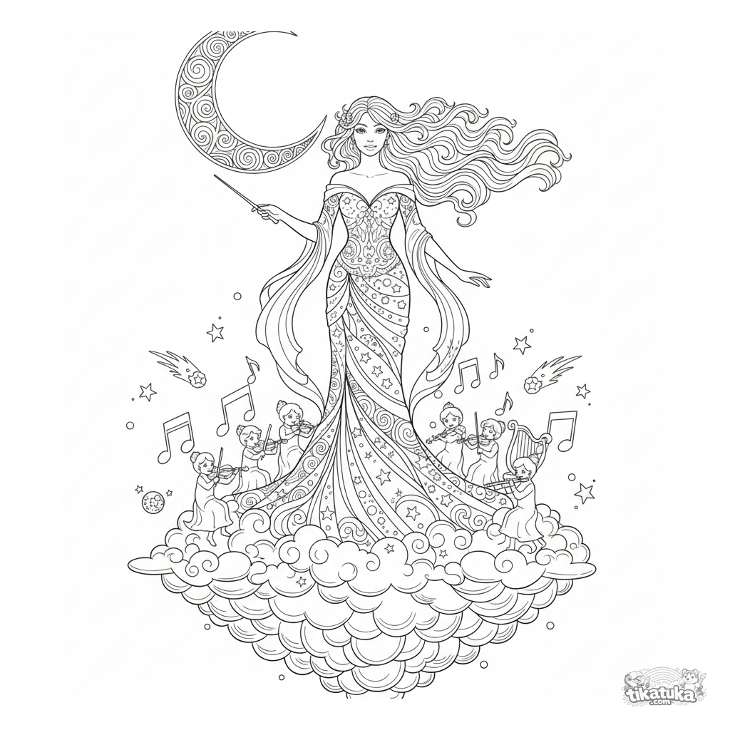 Página para colorear detallada para niñas 10-12 años: una princesa del cielo dirige una orquesta de notas de luz estelar en una terraza de nubes.