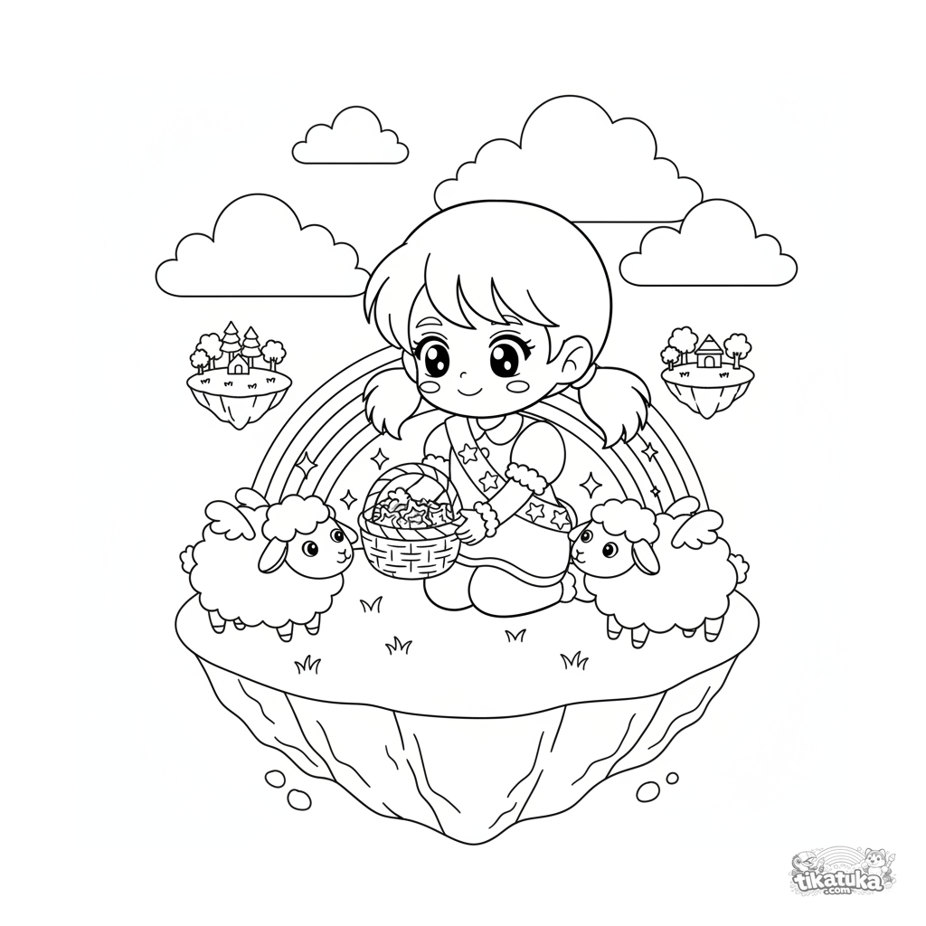 Página para colorear para niños de 4-6 años: una princesa del cielo en una isla flotante ofrece golosinas con forma de estrella a esponjosas ovejas de nube. Escena brillante y amable.