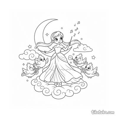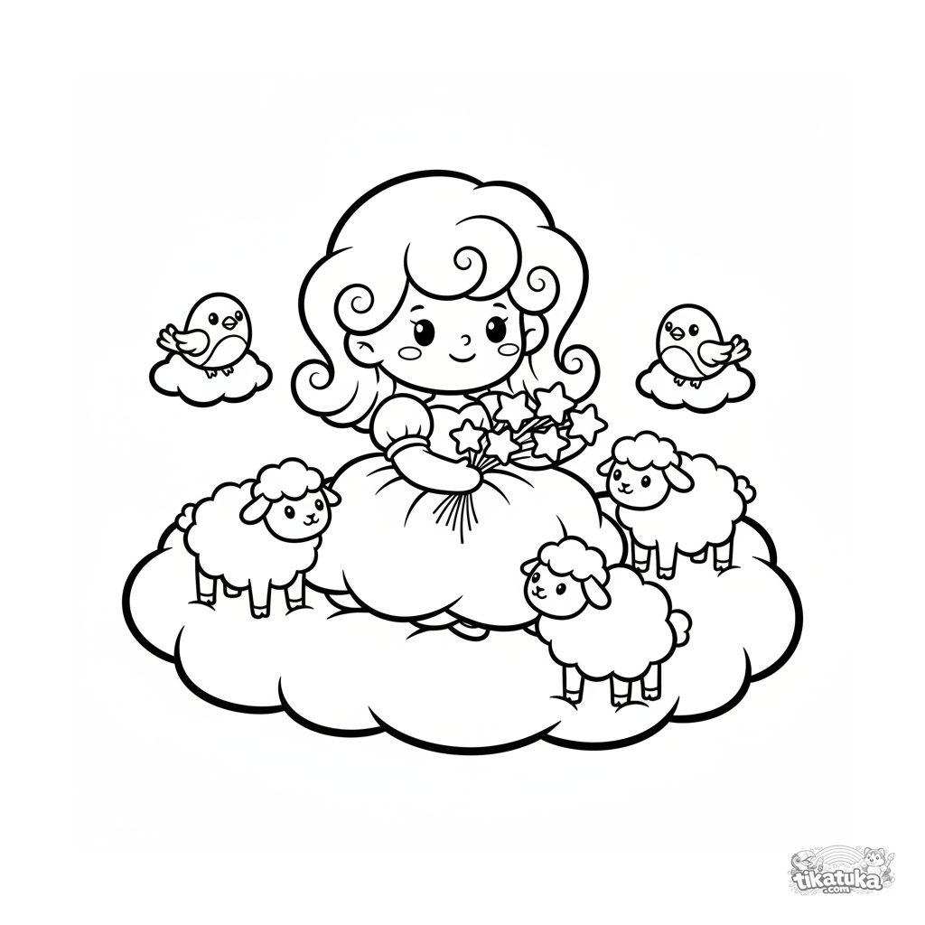 Página para colorear simple para niños pequeños 2-3: una princesa del cielo alimenta a adorables ovejas de nube. Formas grandes, contornos gruesos.