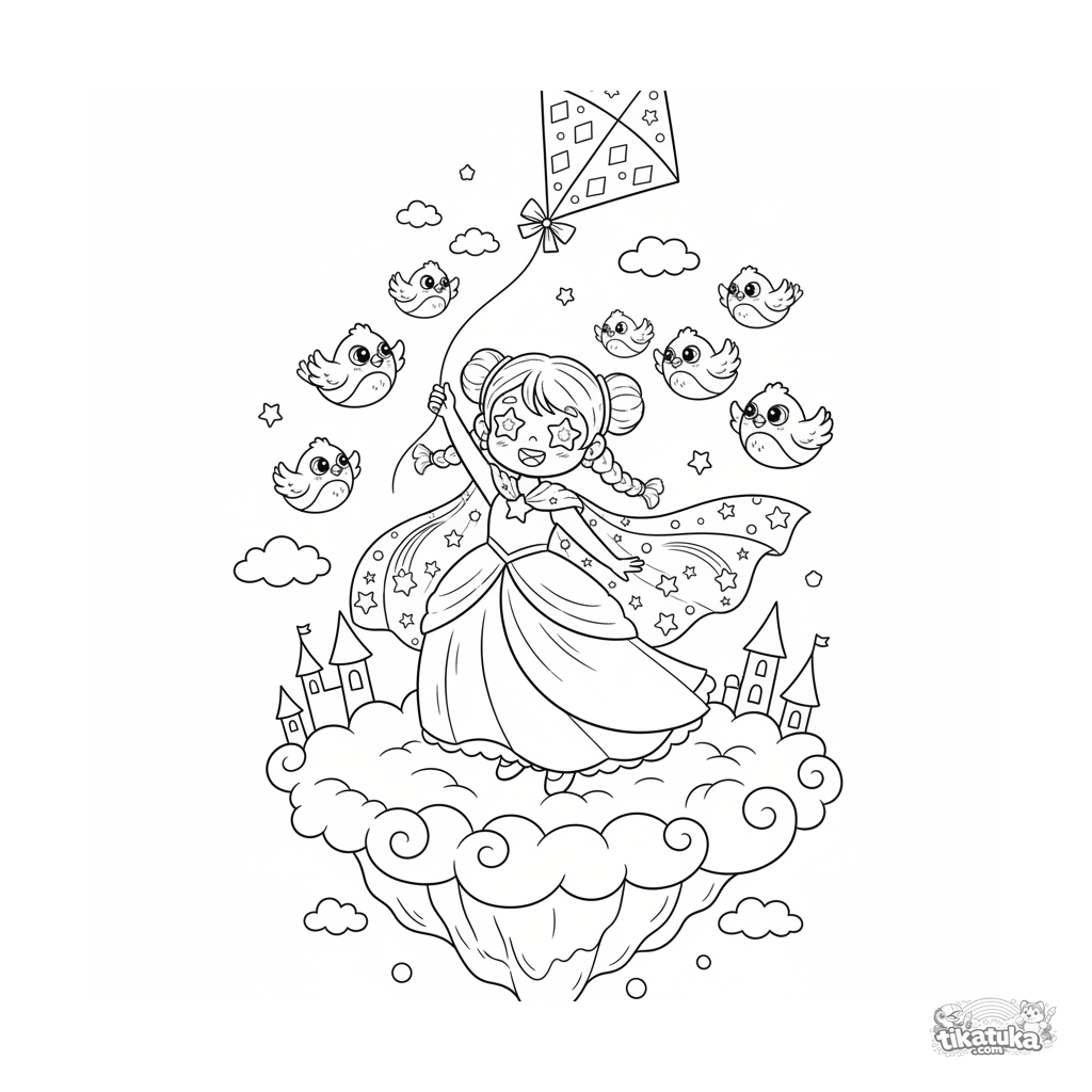 Página para colorear para 4-6 años: una princesa del cielo con una capa estrellada vuela una cometa desde una terraza de nubes esponjosas, con pajaritos volando alrededor.