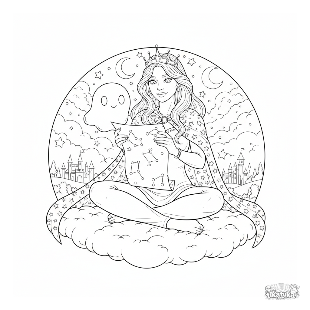 Página para colorear detallada para niños de 10 a 12 años: una princesa del cielo con capa estrellada lee pergaminos antiguos en una terraza de nubes.