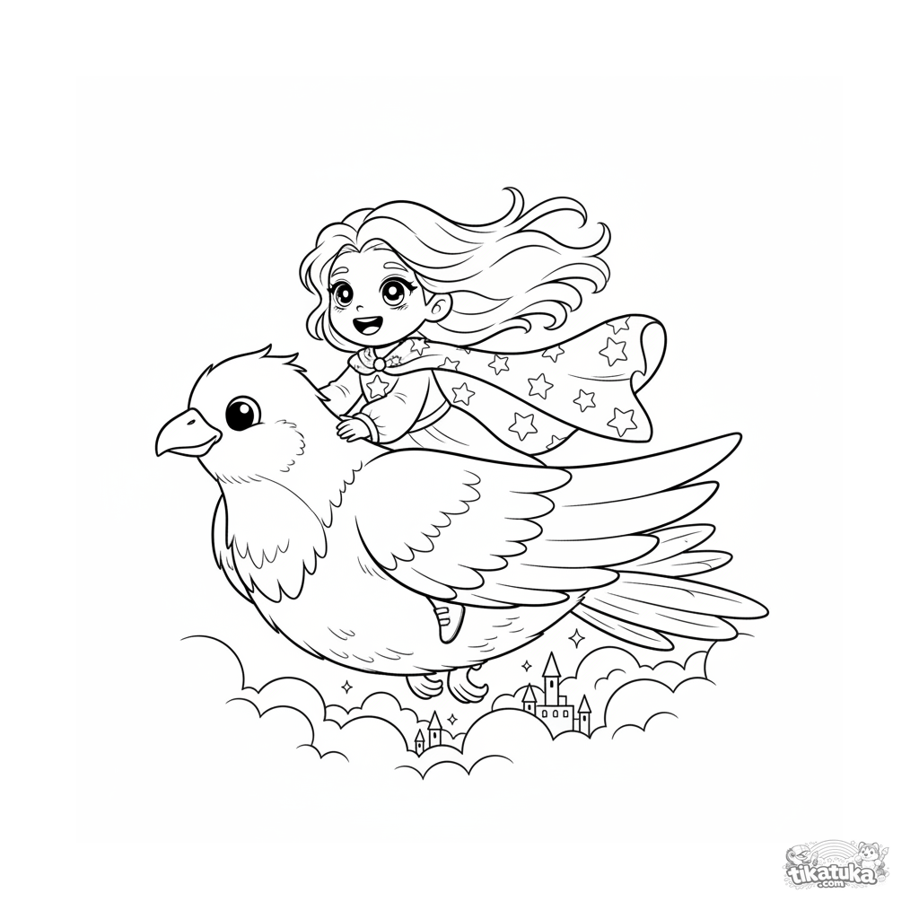 Página para colorear para 7-9 años: una princesa del cielo monta un pájaro gigante sobre un reino de nubes. Escena dinámica.
