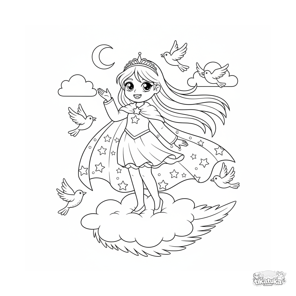 Página para colorear para 7-9 años: una princesa del cielo con una capa bonita está sobre una nube esponjosa con forma de pluma. Escena mágica y dinámica con luna y pájaros.