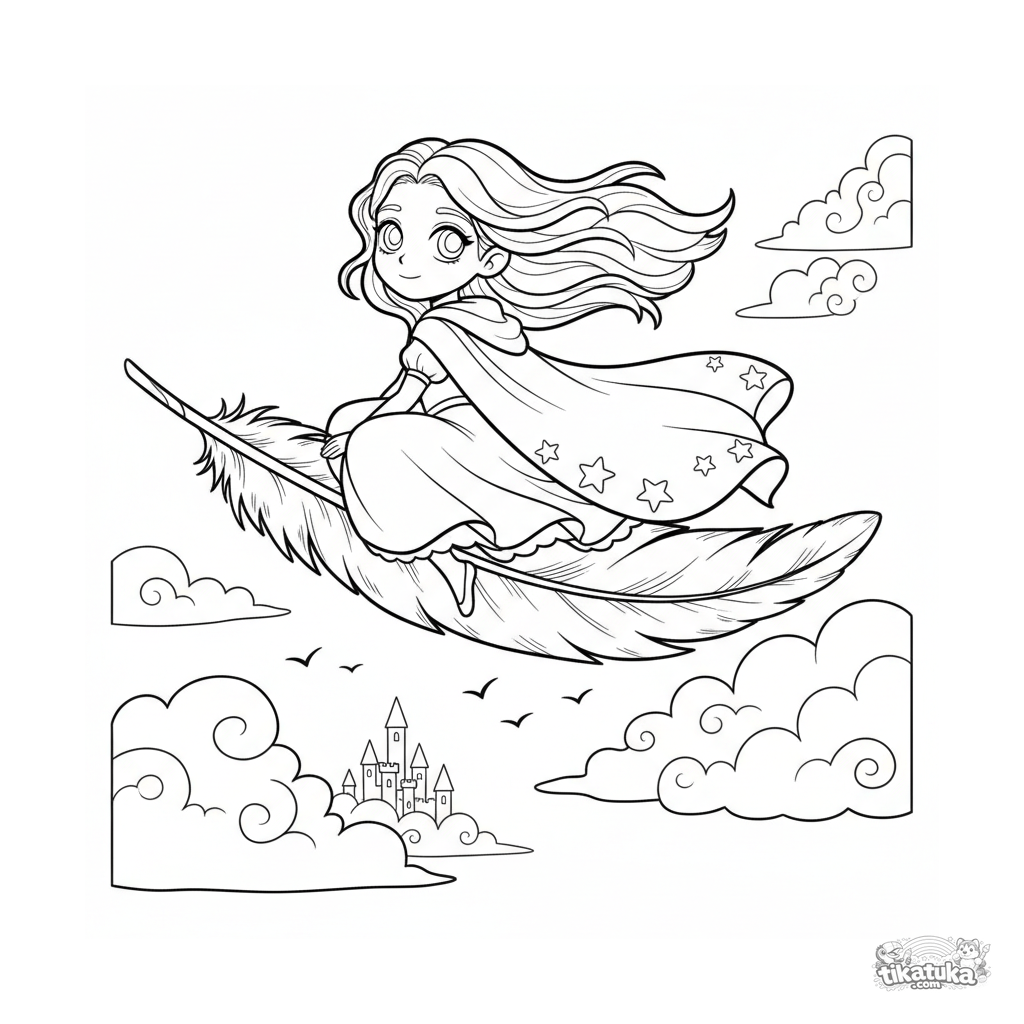 Página para colorear para 7-9 años: una princesa del cielo en una capa ondeante monta una pluma gigante sobre un reino de nubes, con un castillo de nubes visible a lo lejos.