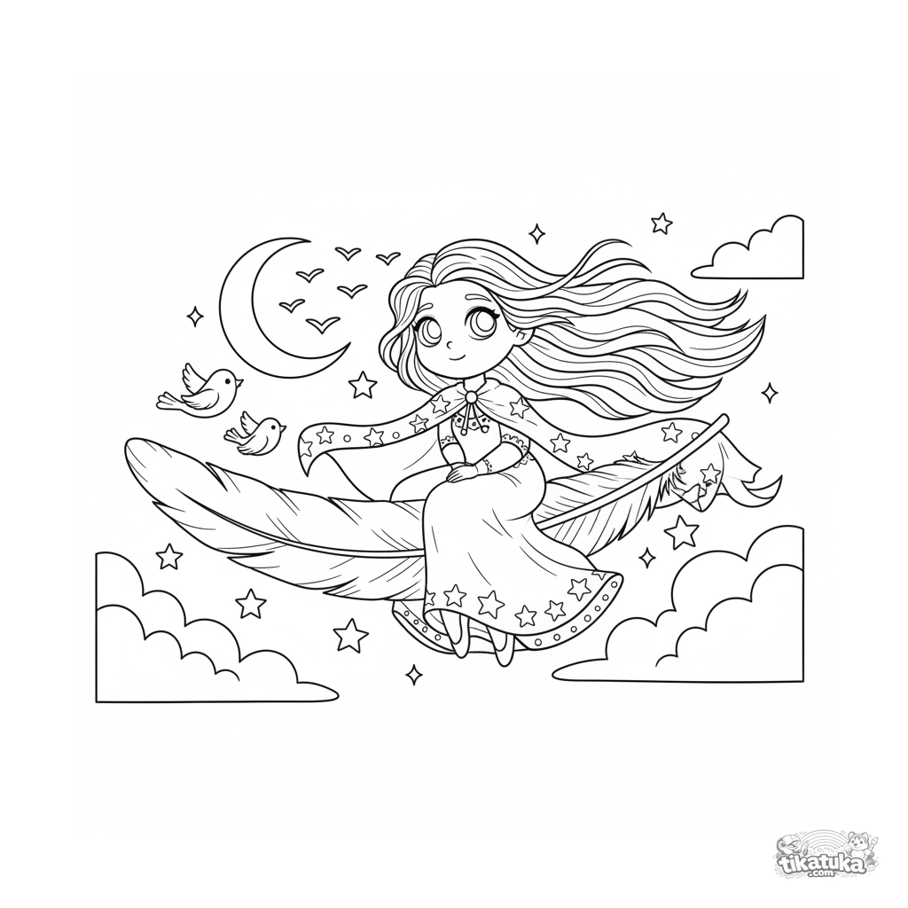 Página para colorear para niños mayores 10-12: una princesa del cielo monta una pluma gigante sobre nubes estrelladas. Escena mágica detallada.