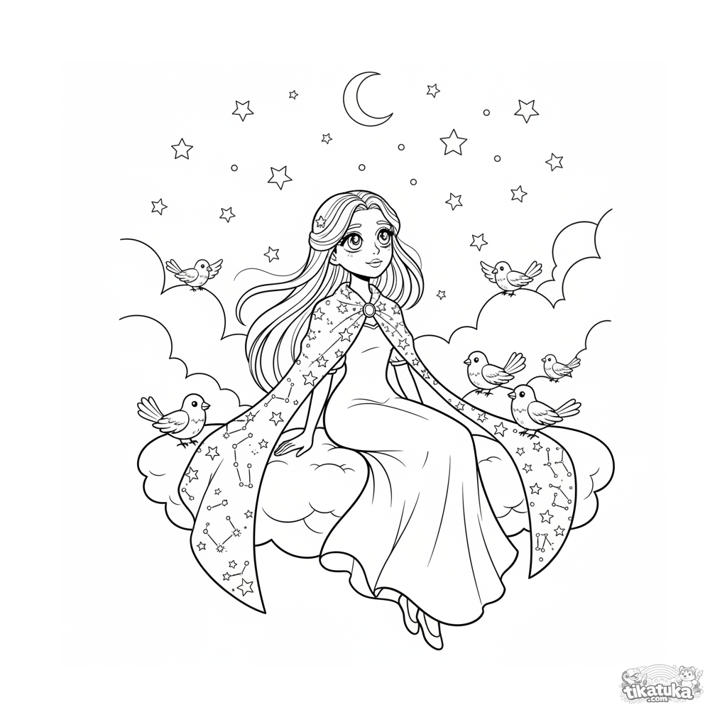 Página para colorear para niños 7-9: una princesa del cielo observa las estrellas desde su terraza de nubes.