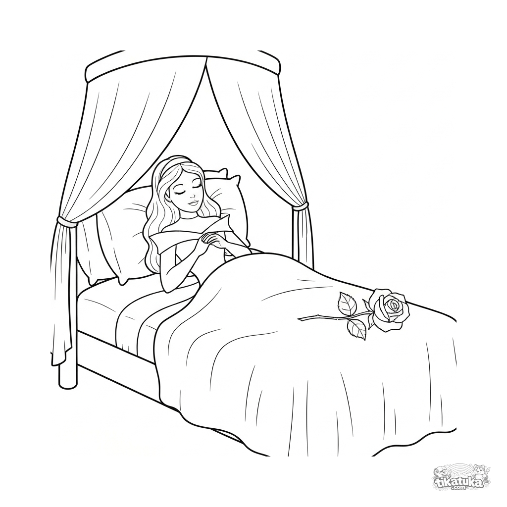 Página para colorear para niños. Bella Durmiente descansando en cama con dosel, manos cruzadas y una rosa sobre la colcha. Descarga gratis.