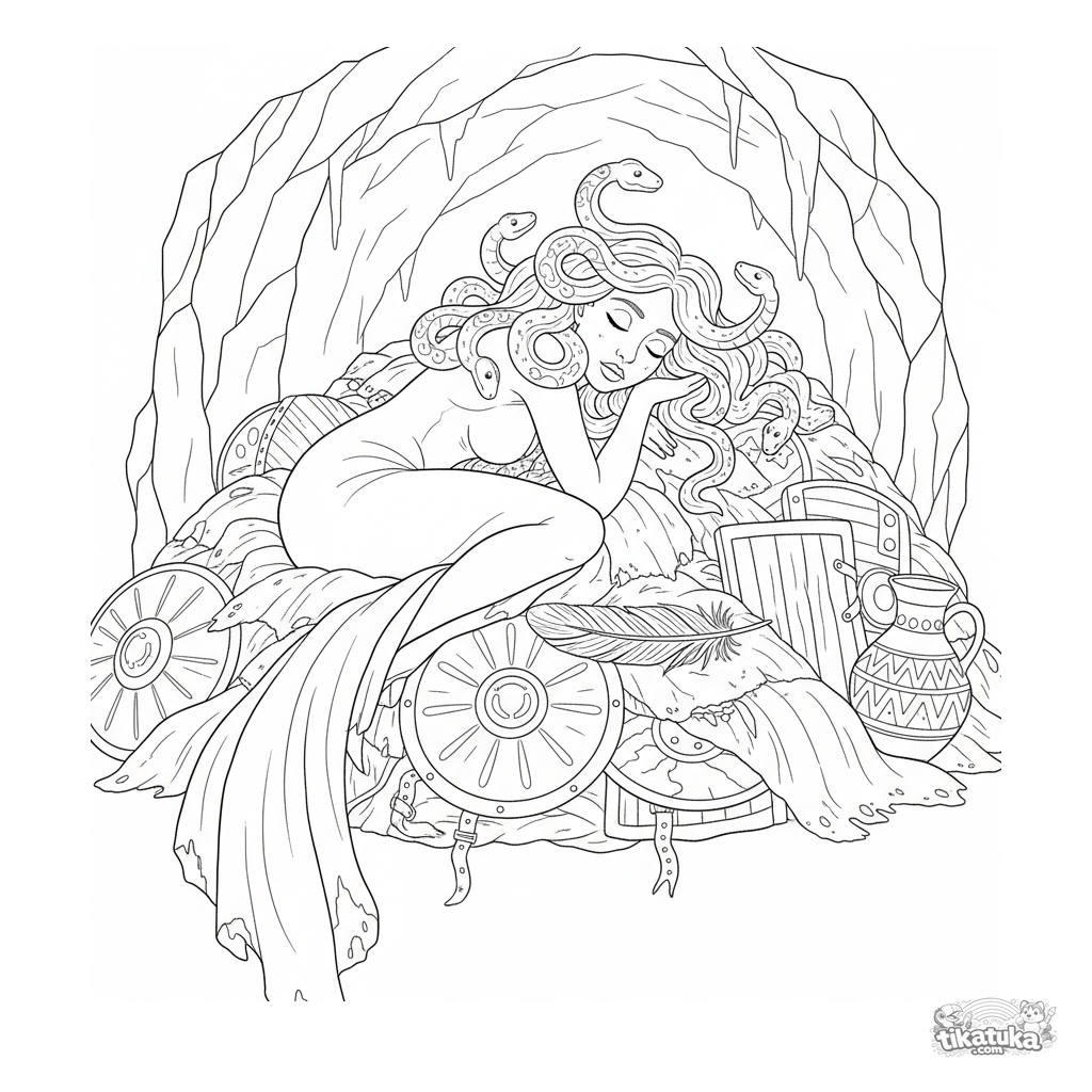 Página para colorear: una Gorgona durmiendo en su guarida. Para niños mayores de 10-12 años. Representación detallada de una criatura mítica con cabello de serpiente.