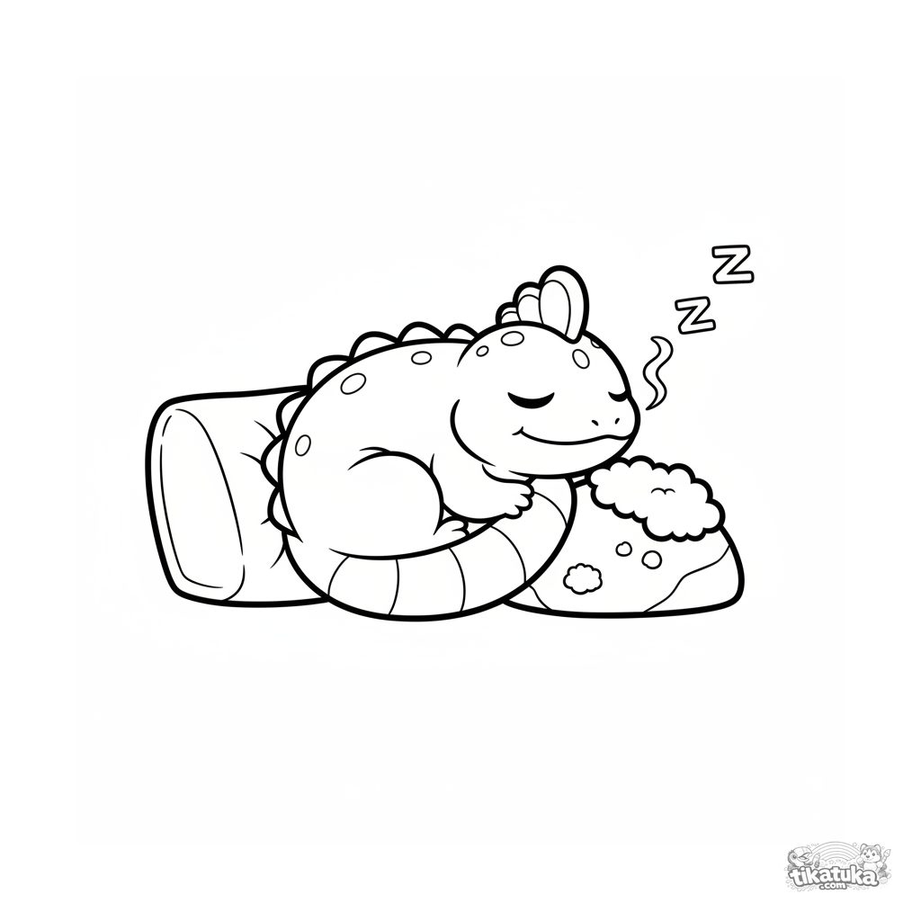 Página para colorear simple para niños pequeños de 2-3 años: un lindo basilisco somnoliento durmiendo contra una antigua piedra cálida. Formas muy simples y grandes para colorear.
