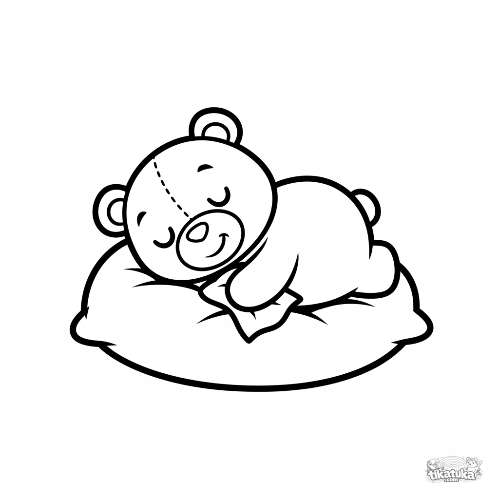 Página para colorear para niños de 2-3 años: un oso de peluche soñoliento descansando en un cojín suave. Contornos simples y áreas grandes para colorear.