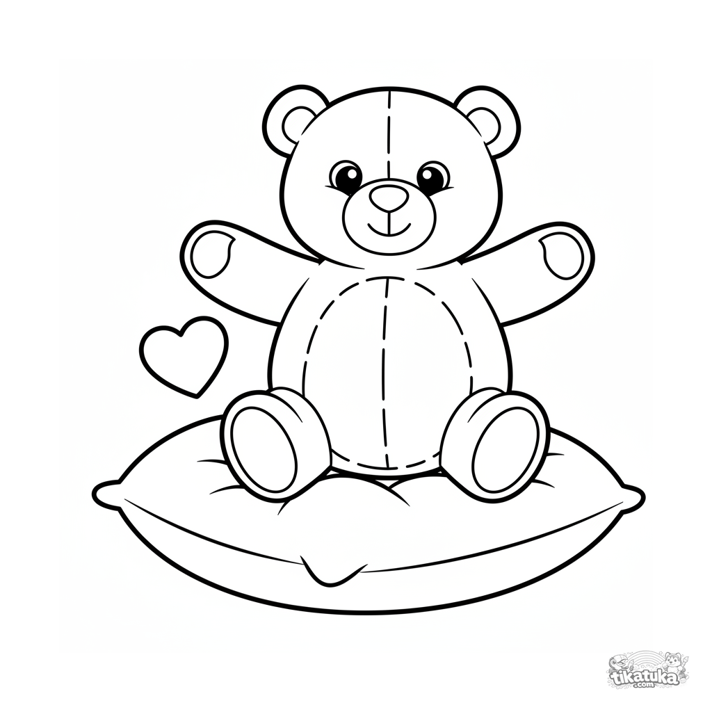 Página para colorear para niños pequeños de 2-3 años: un osito de peluche soñoliento sentado en un cojín suave. Formas grandes y simples, pocos detalles, amplios márgenes blancos.
