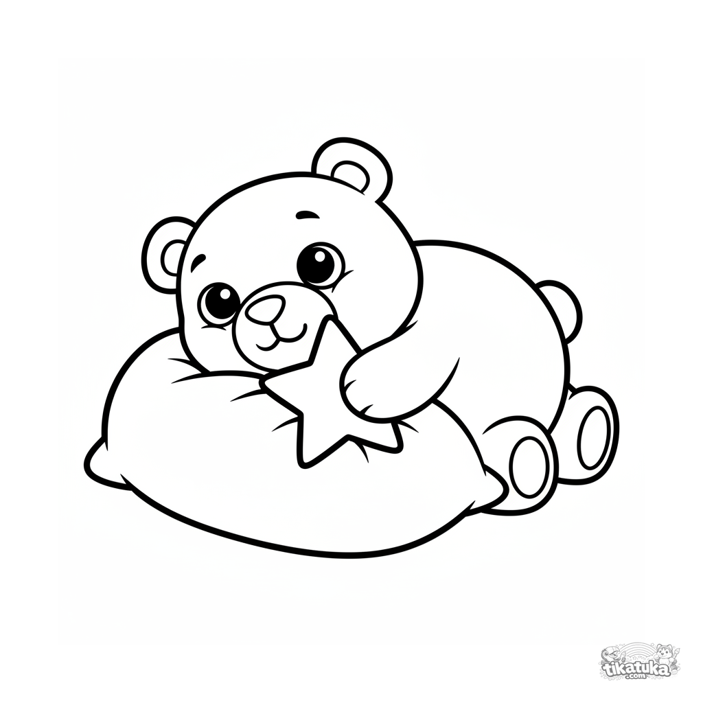 Página para colorear para niños de 2-3 años: un oso de peluche dormilón descansa en una almohada suave. Formas grandes y simples, pocos detalles.