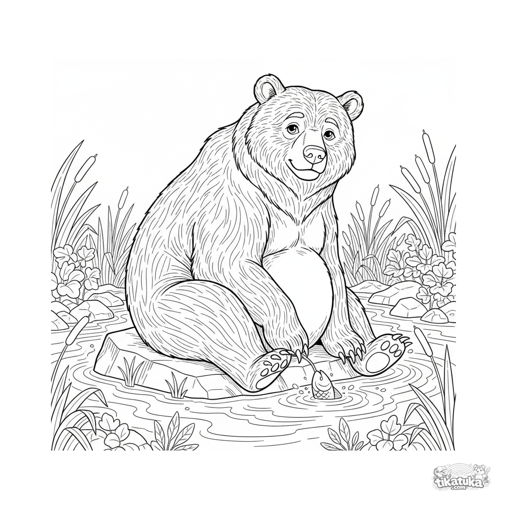 Página para colorear detallada para 10-12 años: un gran oso pardo sentado pacientemente en una roca en un arroyo, pescando. Escena realista de naturaleza veraniega.