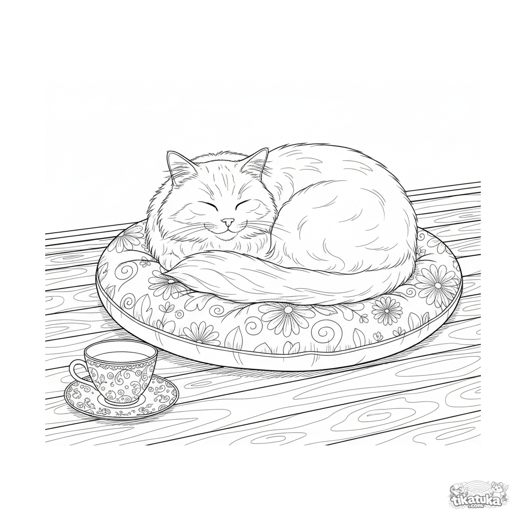Página para colorear detallada para mayores de 10-12 años: un gato esponjoso duerme en un cojín en un rayo de sol en el porche. Una taza de té cerca.