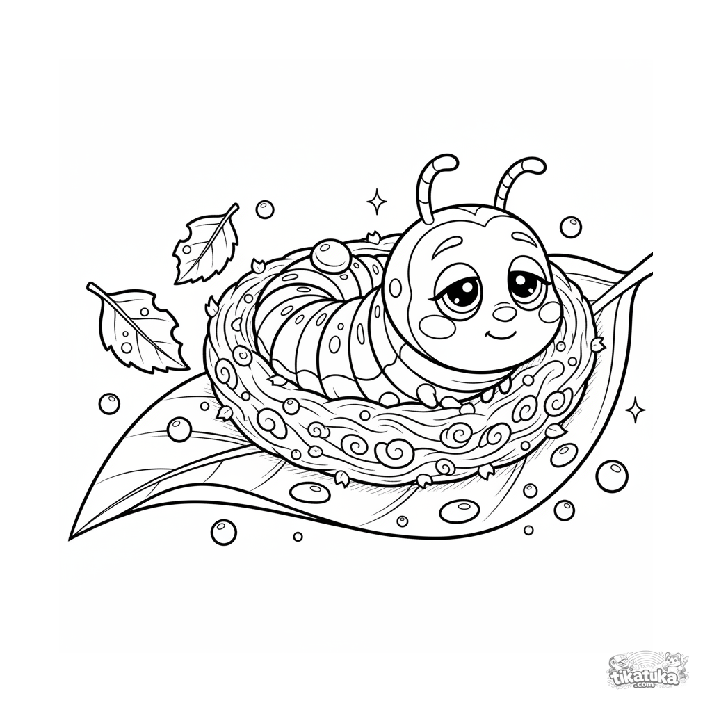 Página para colorear para 4-6 años: una oruga somnolienta durmiendo en un nido de seda en una hoja grande con rocío.