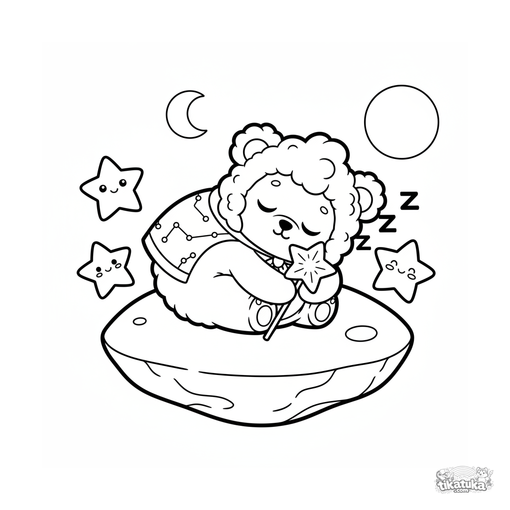 Página para colorear simple para bebés 2-3: un guardián de constelaciones dormilón duerme en una roca flotante, sosteniendo una estrella de noche.