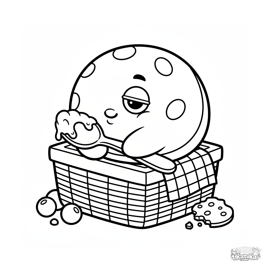 Página muy simple para colorear para bebés de 2-3 años: un monstruo con forma de dónut durmiendo en una cesta de picnic. Formas grandes.