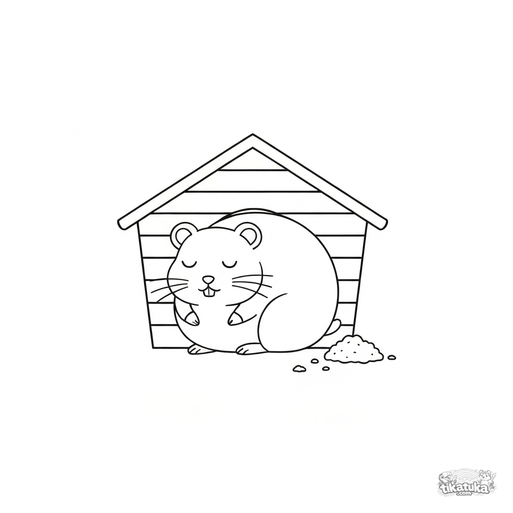 Página para colorear para niños pequeños: un hámster dormilón duerme en su casa de madera. Detalles grandes y contornos simples para 2-4 años.