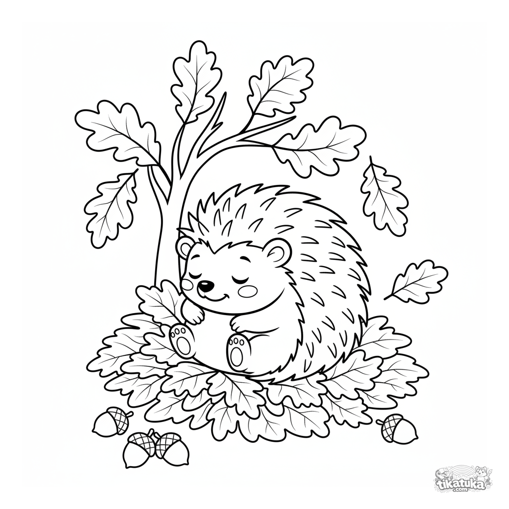 Página para colorear de un erizo soñoliento para niños de 4 a 6 años. El erizo duerme en un nido de hojas de otoño bajo un roble.
