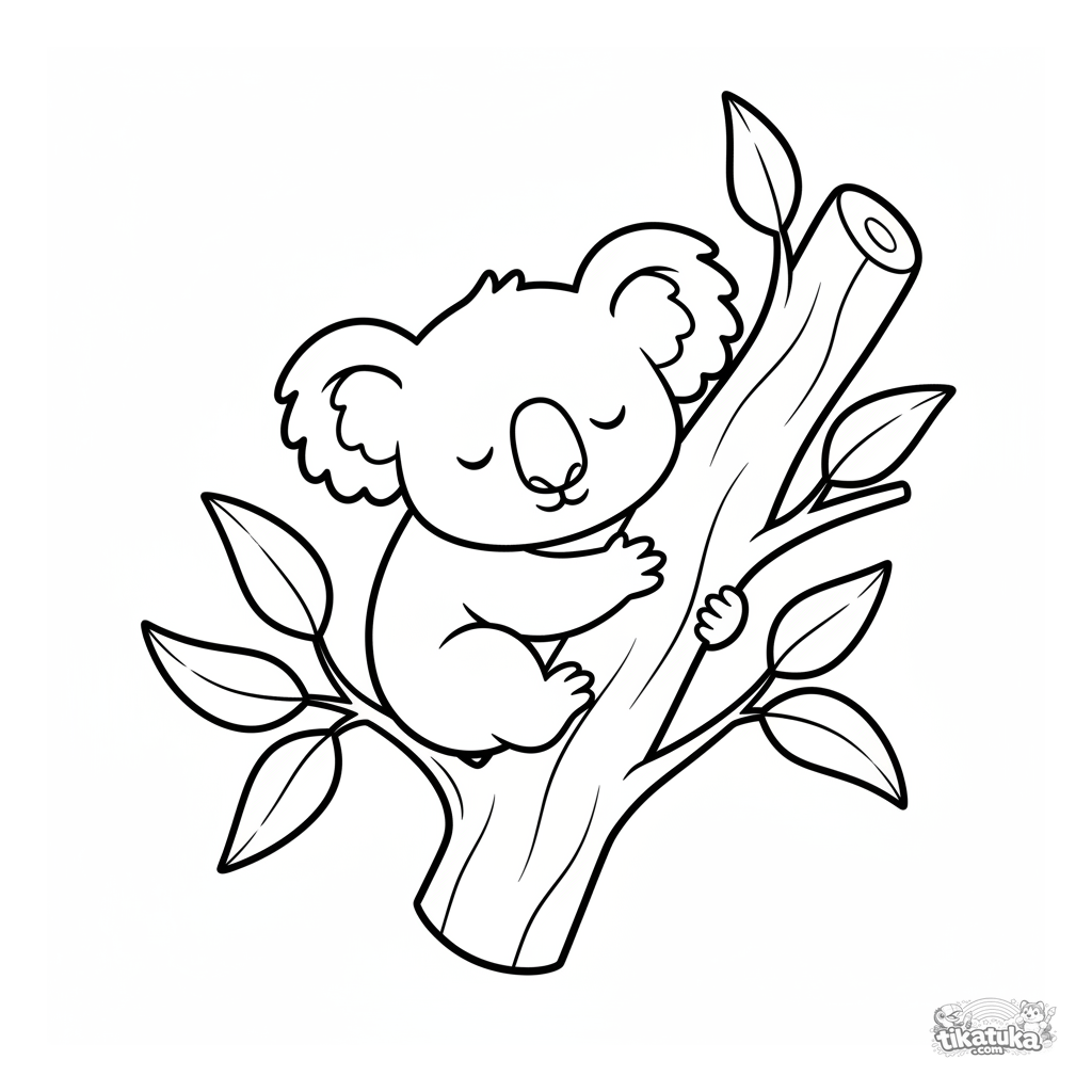 Página para colorear para niños pequeños: un koala cachorro soñoliento aferrado a una rama de eucalipto. Formas grandes y simples con amplios márgenes.