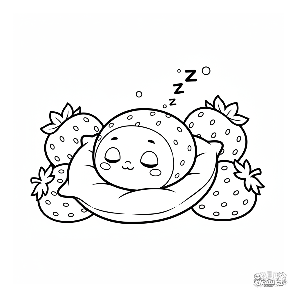 Página simple para colorear para niños de 2-3 años: un mochi de fresa soñoliento durmiendo en una almohada de hoja. Formas grandes, márgenes amplios para primeros crayones.